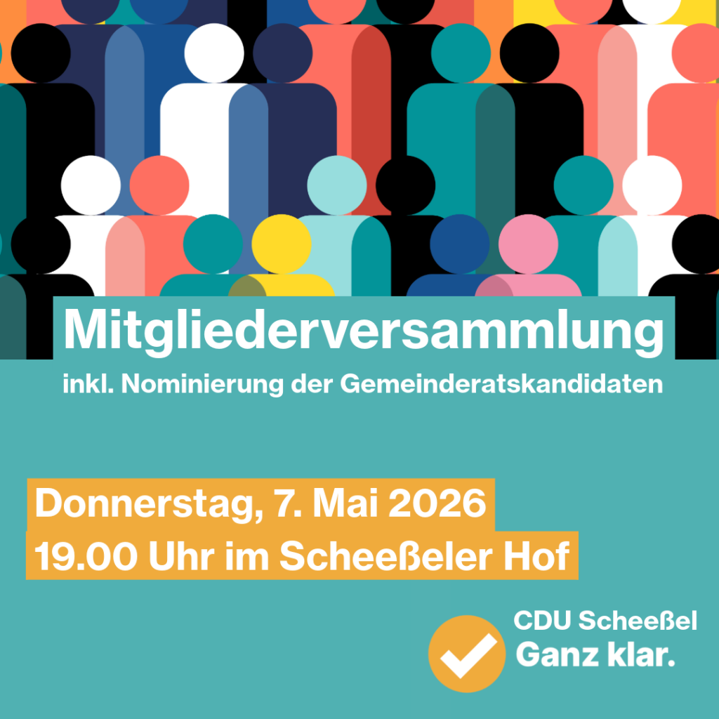 Am Donnerstag 7. Mai 2026 findet um 19 Uhr die diesjährige Mitgliederversammlung des Gemeindeverbandes statt. Wir freuen uns wieder im Scheeßeler Hof tagen zu können. Diese Mitgliederversammlung steht ganz im Zeichen der kommenden Kommunalwahl und daher wird es im 2. Teil des Abends auch um die Nominierung der Gemeinderatskandidatinnen und -kandidaten – also um die Aufstellung der CDU-Liste für die Gemeinderatswahl – gehen. Wir freuen uns über zahlreiches Erscheinen und das gemeinsame Einstimmen auf die Wahlkampfzeit.